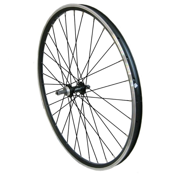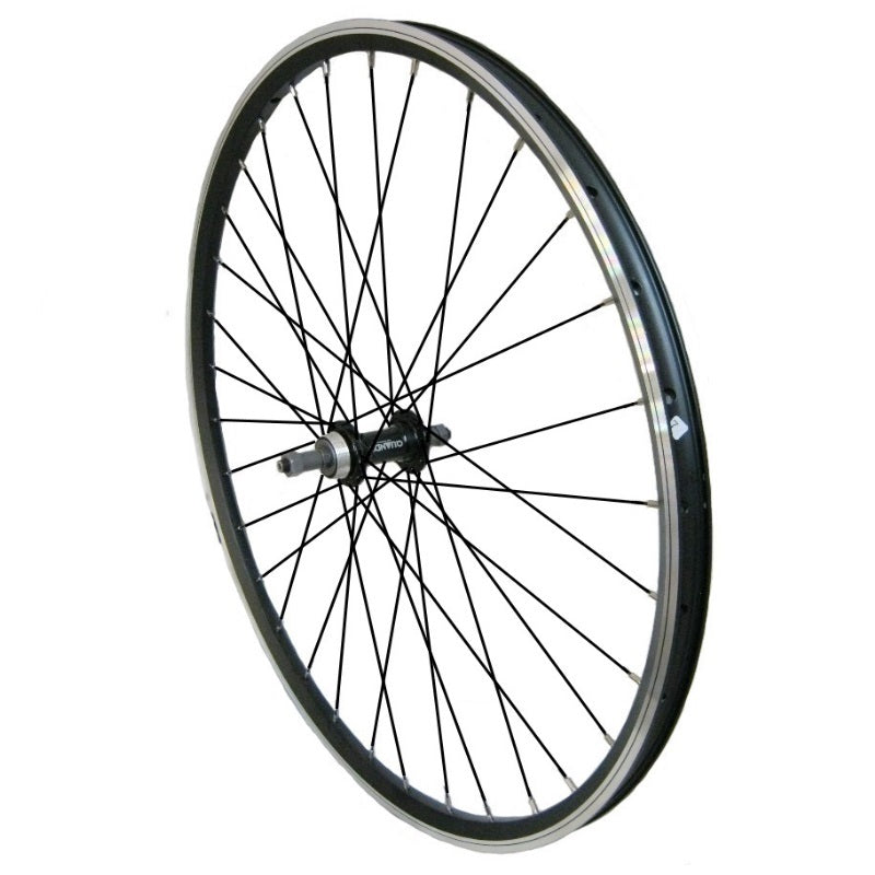 This built up rear wheel features a single wall alloy rim and an alloy hub with threading and spacing to fit a standard screw-on cluster. It is laced with 32 spokes and features a hollow 3/8" axle with a 5mm quick release skewer.