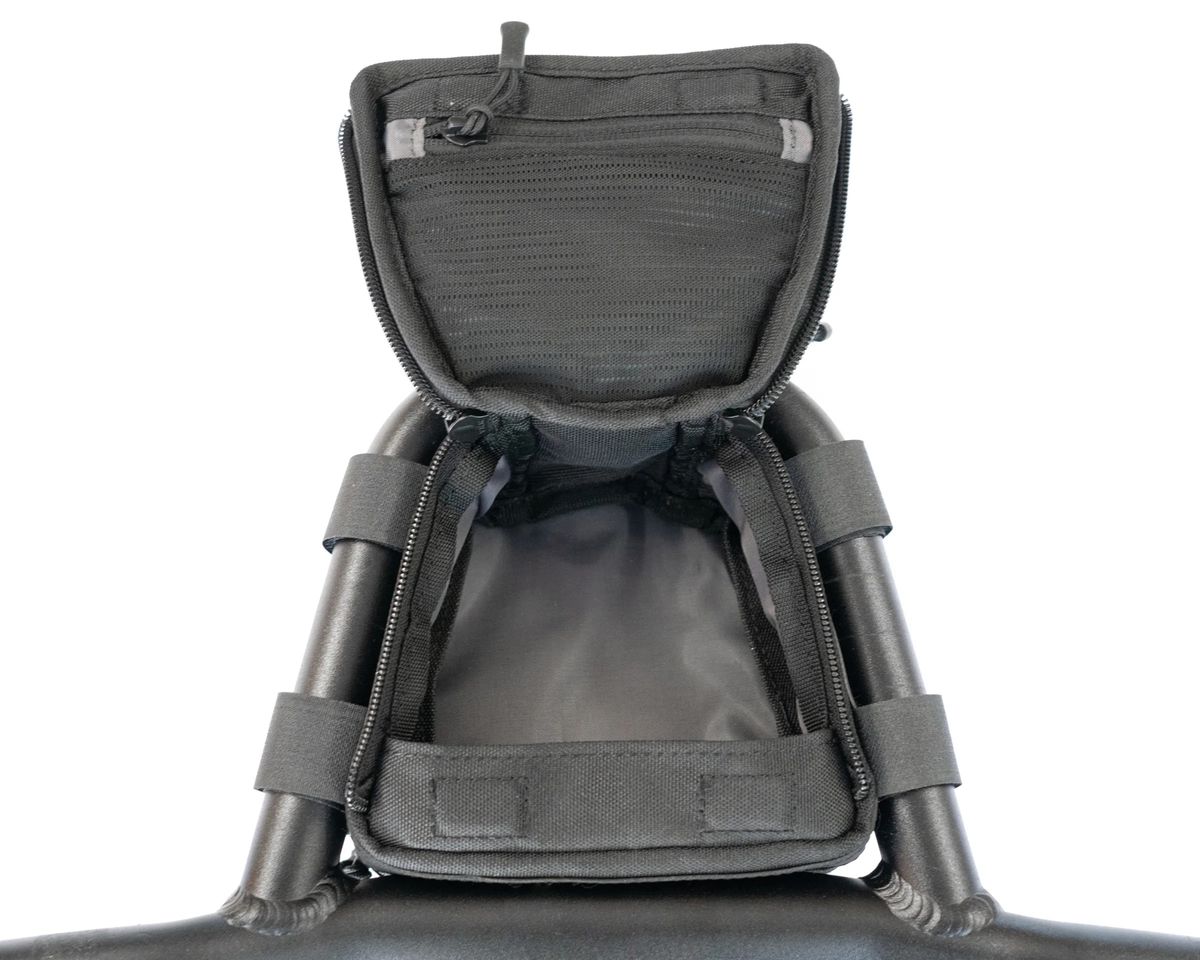 The Kitchen Sink Handlebar Bag fits securely inside the loop of the Kitchen Sink Handlebar and is designed to allow you to easily access all your essentials with one hand, even while riding. The bag features a magnetically secured top flap, two side zippers for additional security, and an expandable bottom to increase storage.